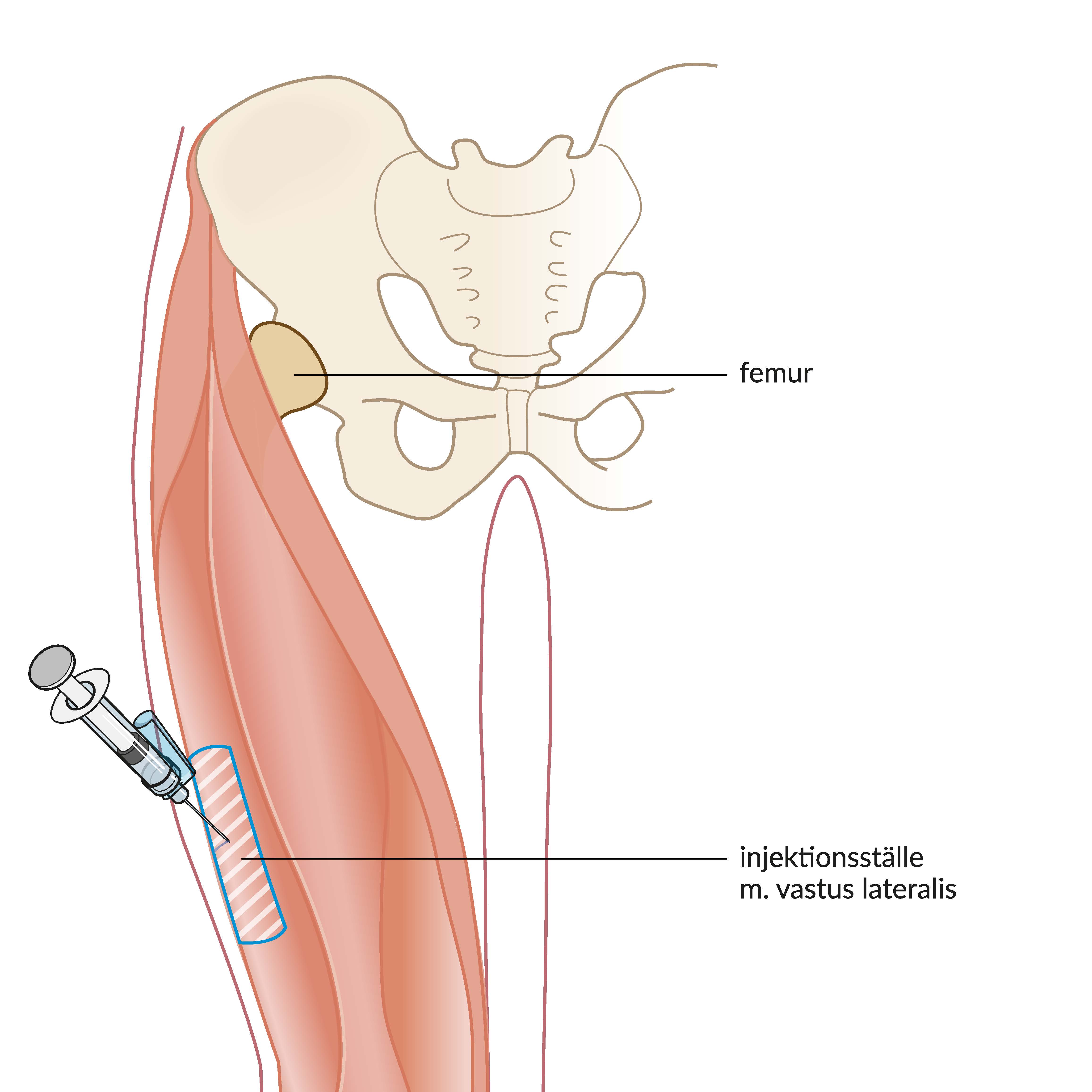 Bilden nedan visar två alternativa injektionsställen. Företrädesvis ges injektion i m.vastus lateralis då detta orsakar minst obehag för patienten. En tänkt mittlinje dras på lårets ovansida och injektionen ges på den yttre (laterala) sidan av denna mittlinje. Vid injektion i m.vastus lateralis delas avståndet mellan trochanter major och patella in i tre delar och i den mittersta tredjedelen ges injektionen. Vid injektion i m.rectus femoris delas avståndet mellan crista iliaca och patella in i tre delar och injektionen ges i den mittersta tredjedelen [4].