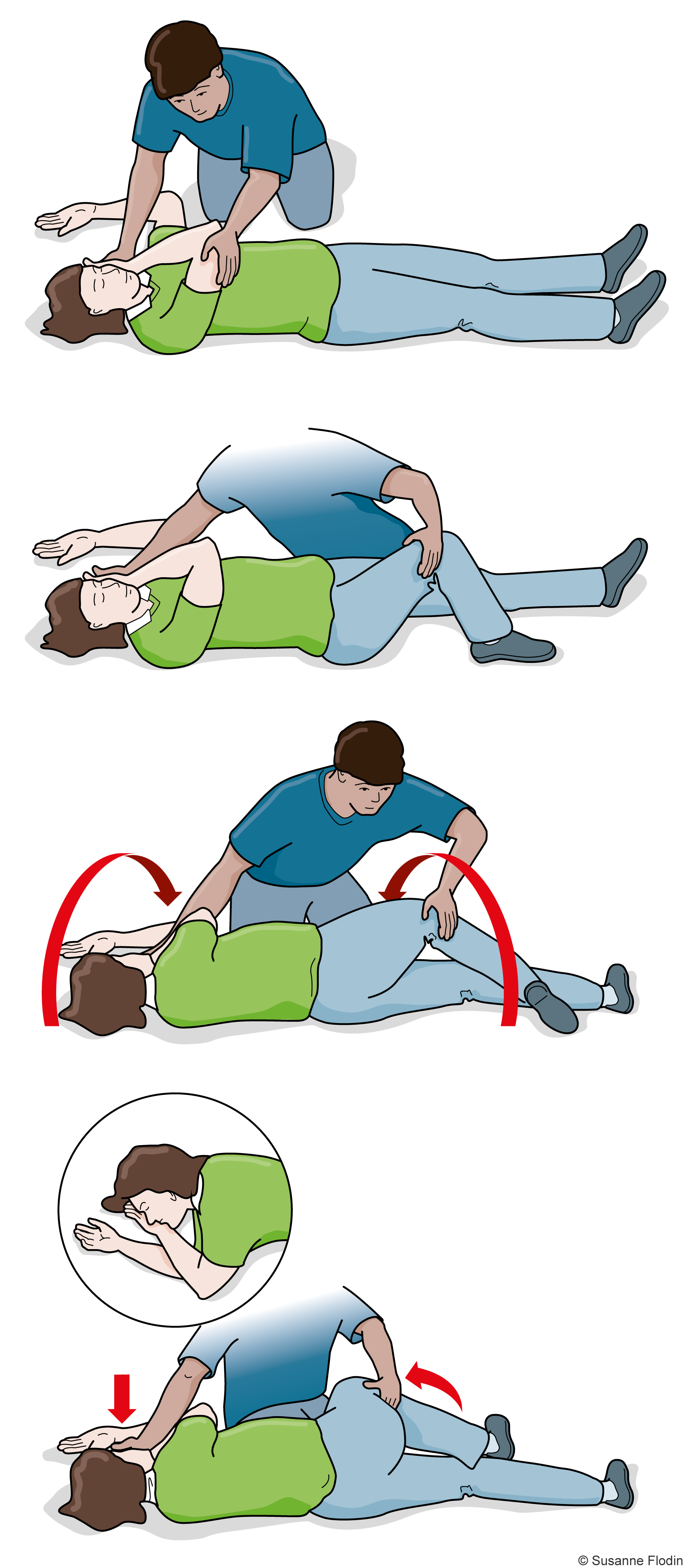 Om personen är medvetslös och andas normalt ska hen läggas i stabilt sidoläge. Vänd alltid en medvetslös person mot dig själv.