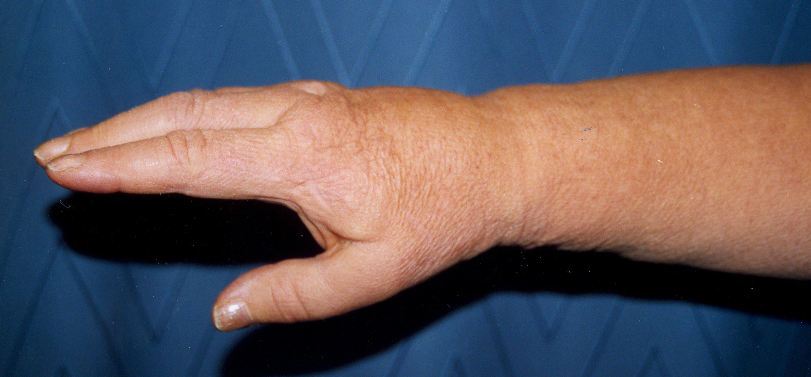 I avvaktan på leverans av nya kompressionsdelar syddes både kompressionshandsken och kompressionsärmen in för att öka trycket och därmed ytterligare minska ödemet.
